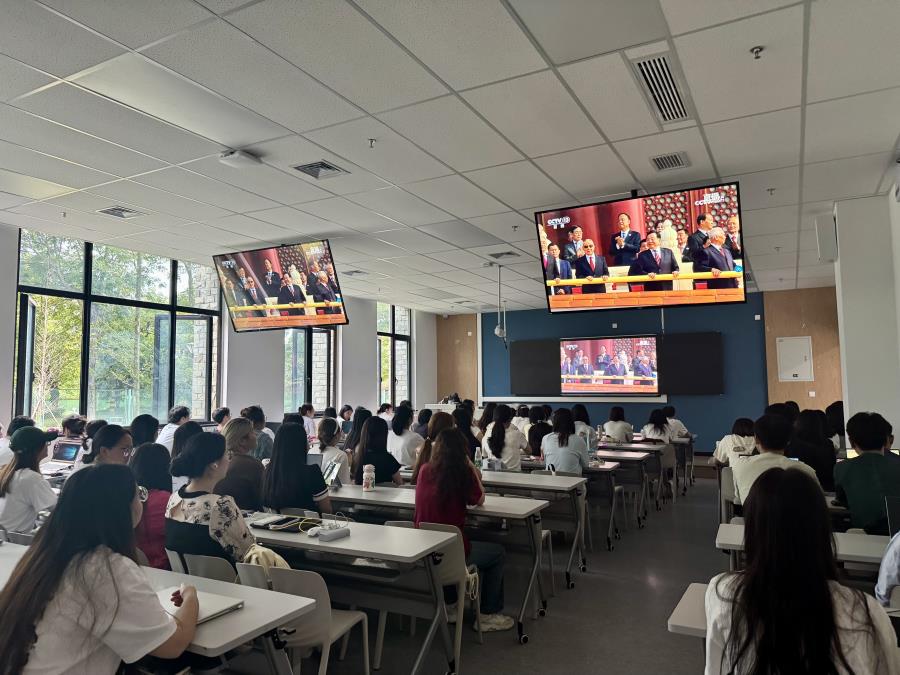 观看过程中,全体师生全神贯注,认真倾听习近平总书记重要讲话,深切感悟铭记历史、缅怀先烈、珍爱和平、开创未来的重大政治意义。师生的目光紧随受阅部队的铿锵步伐,见证这一历史性的时刻。当各方队和现代化武器装备、空中梯队的多型战机依次亮相时,观看现场爆发出热烈掌声,师生们的民族自豪感油然而生。